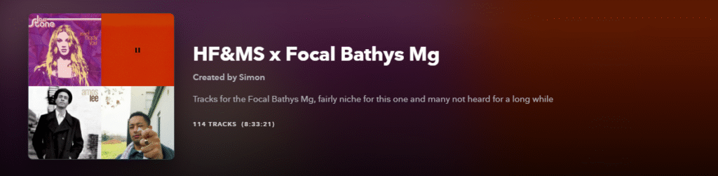 With excellent HiFi equipment comes excellent, long playlists. The most recent one has been for the Focal Bathys MG. This TIDAL playlist includes current favourites, Raat Ki Rani remixed by an outfit called Khruangbin from Texas, as well as the very angry Vampire and Loyle Carner’s Loose Ends.